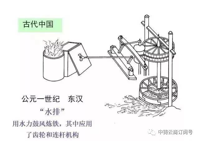 公元一世纪 东汉“水排”用水力鼓风炼铁,其中应用了齿轮和连杆机构
